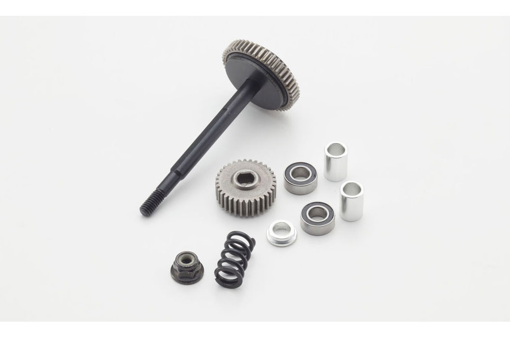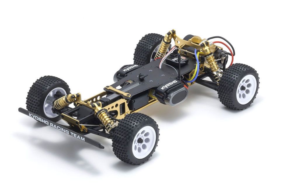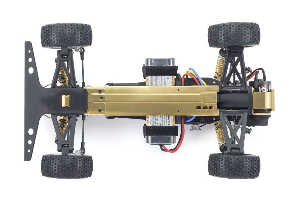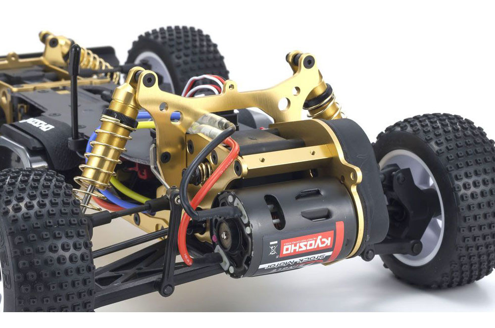 Simple design of the aluminum backbone-style chassis realizes high rigidity. A total of 15 key gold anodized aluminum components that were optional upgrades in the original such as main chassis, shock stay, and motor guard are included as standard.