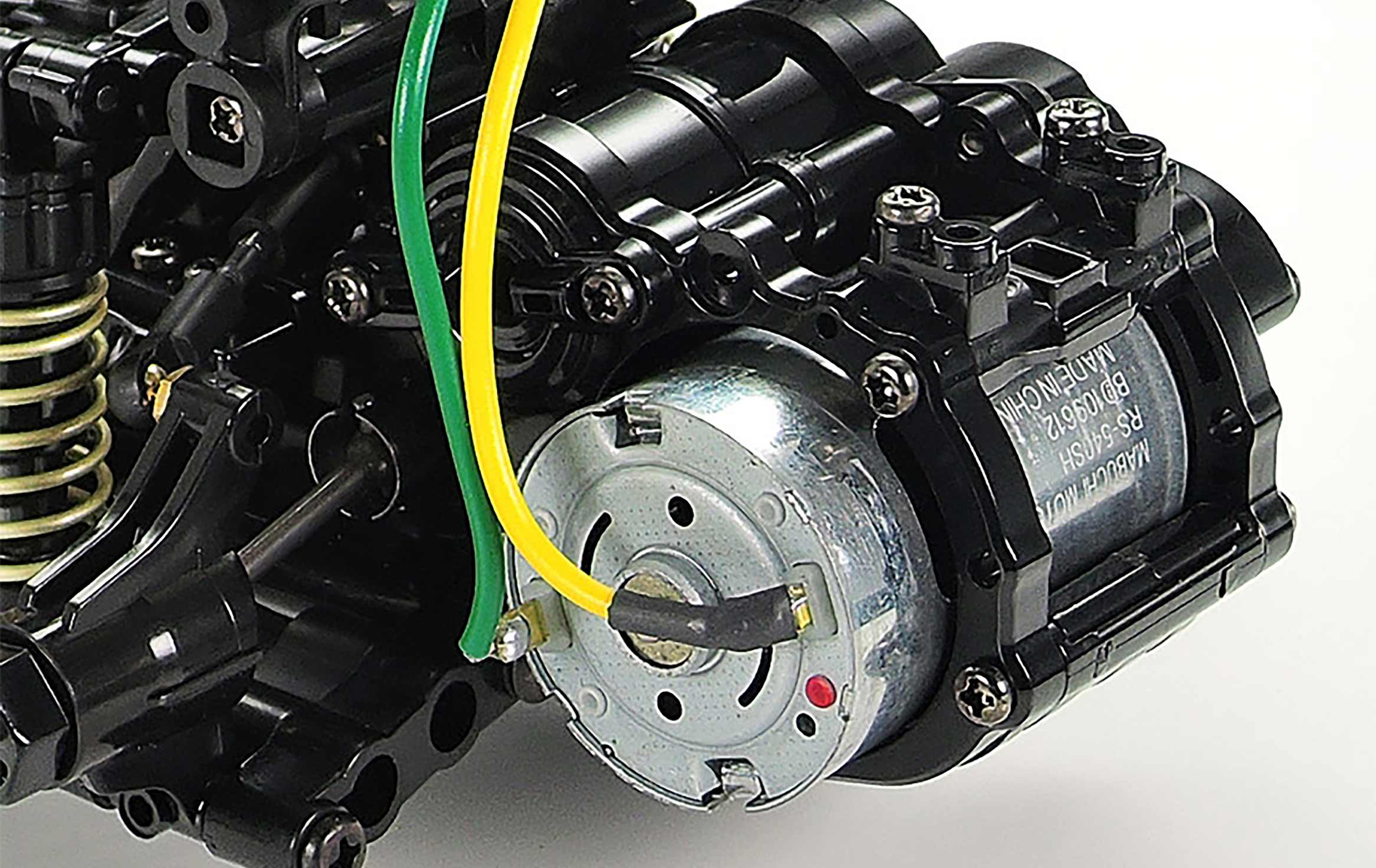 The M-06 chassis features a rear-mounted motor, rear-drive setup and features a longitudinally-mounted battery pack, with R/C equipment positioned on either side for optimum balance and a low center of gravity. 4-wheel double wishbone suspension uses metal-plated wheels, equipped with 60D radial tires at the front and 60D super grip tires at the rear. In addition, a 3-piece steering linkage offers nimble handling response. A large bumper is included.