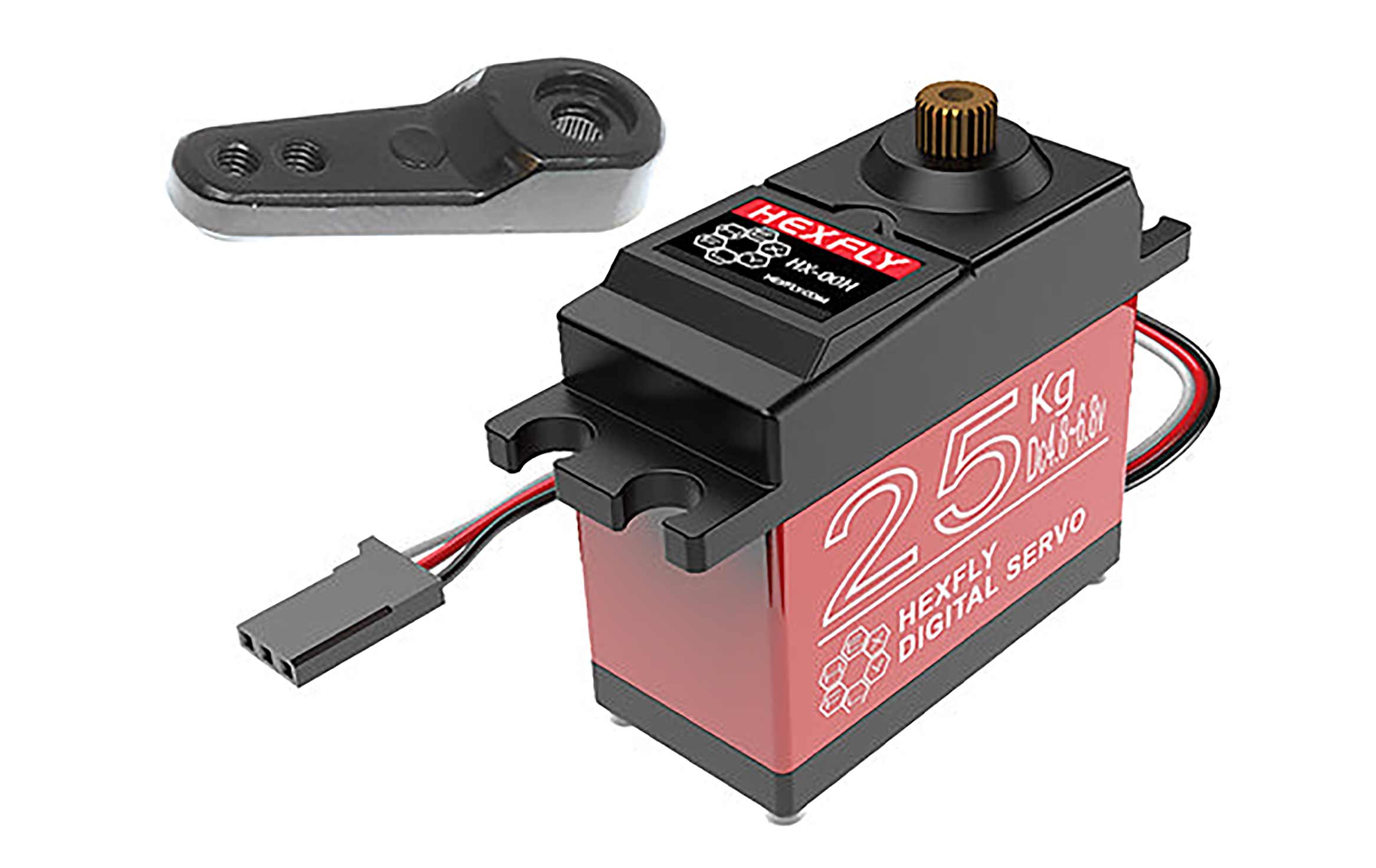 Metal servo horn, waterproof, internal steel gears, 25kg torque, 5 to 7.4 voltage range, and aluminum center case.