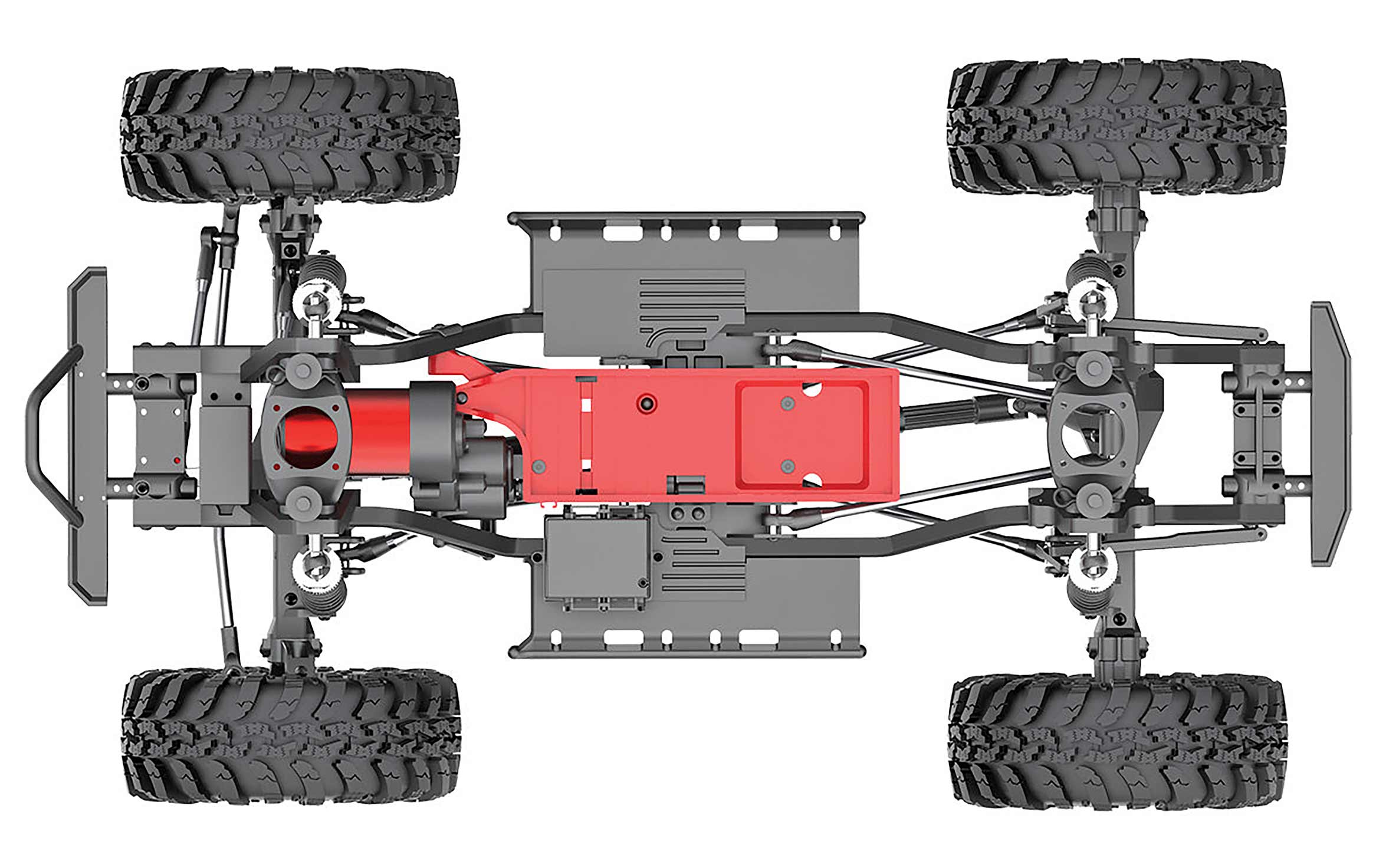 The Wendigo features a front mounted motor, centrally mounted divorced transer case and strategically placed battery tray. This setup offers excellent weight distribution which causes the Wendigo to behave predictably when climbing over obstacles.