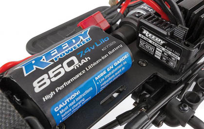 Water-resistant Reedy Power speed control with high-current T-plug connector, Reedy brushed 380 motor, 850mah Li-Ion 7.4V 2-cell battery and charger
