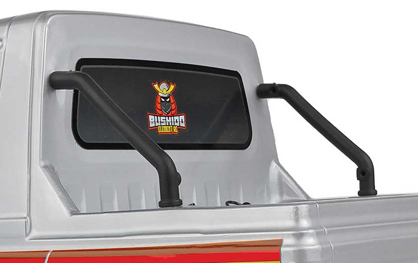 The Bushido Trail Truck body features a thermoformed high-strength polycarbonate one-piece cab and bed design with highly detailed decals and injection-molded front bumper. Also included is an extra decal sheet that contains optional overlanding graphics and sponsor logos to outfit the Bushido Trail Truck for a custom look.