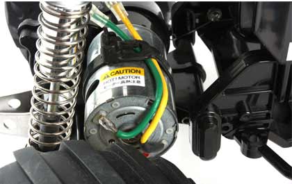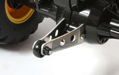 The durable and easy-to-assemble 2WD chassis employs a box type frame, and features front independent swingarms and a rear rolling rigid suspension. Big 115mm diameter tires offer dynamic running on even the toughest of surfaces. Sealed gearbox protects the diff gear from dirt and sand during off-road driving. Rear mounted wheelie bar enables wild stunt driving.