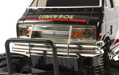This R/C assembly kit features the trademark boxy minivan body with metal-plated fenders, front grille and dampers, and includes a sticker set to add the finishing touches. All this is raised up over monster truck wheels cased in 115mm tires for a cool number that you can take for a spin any time, anywhere.