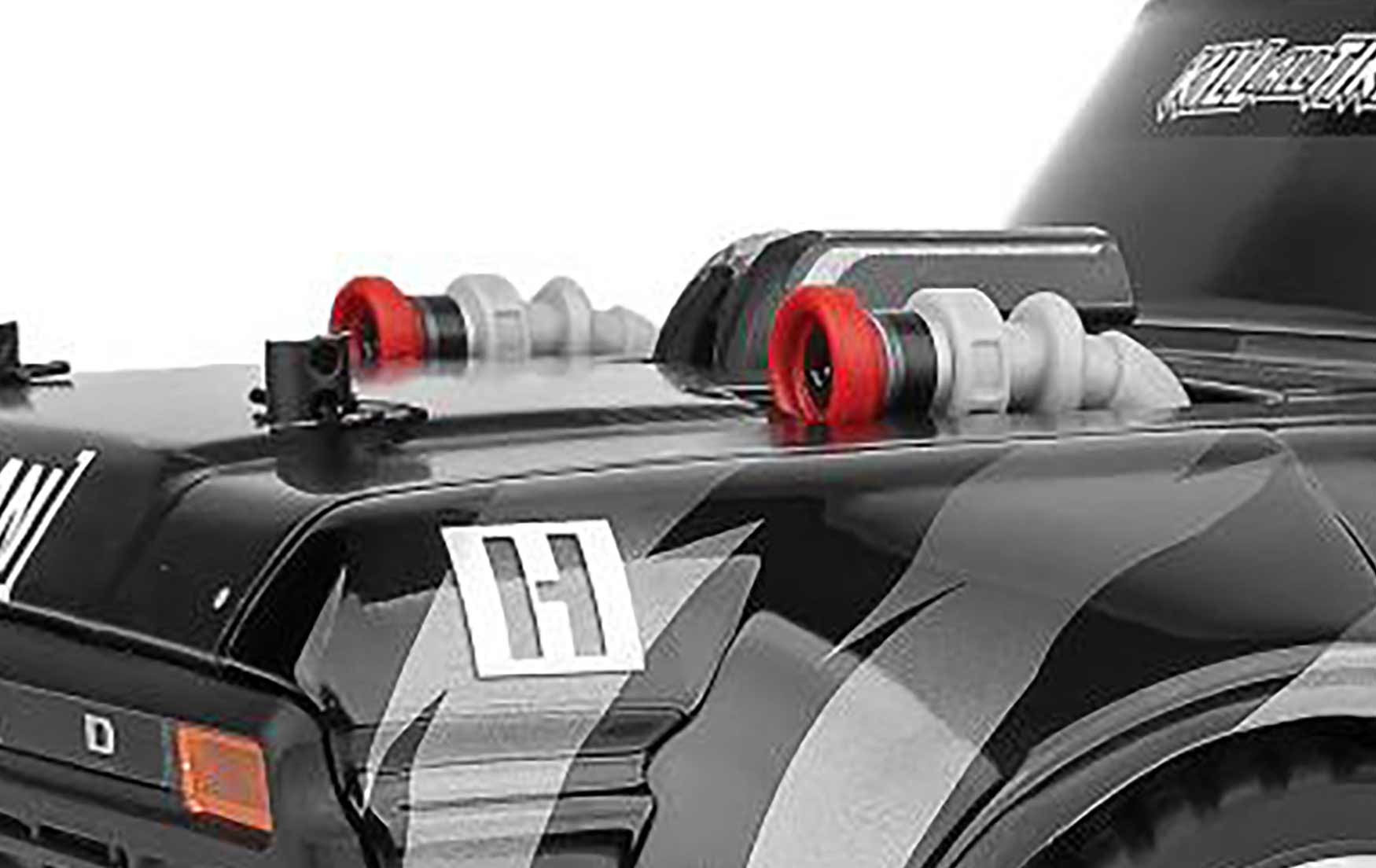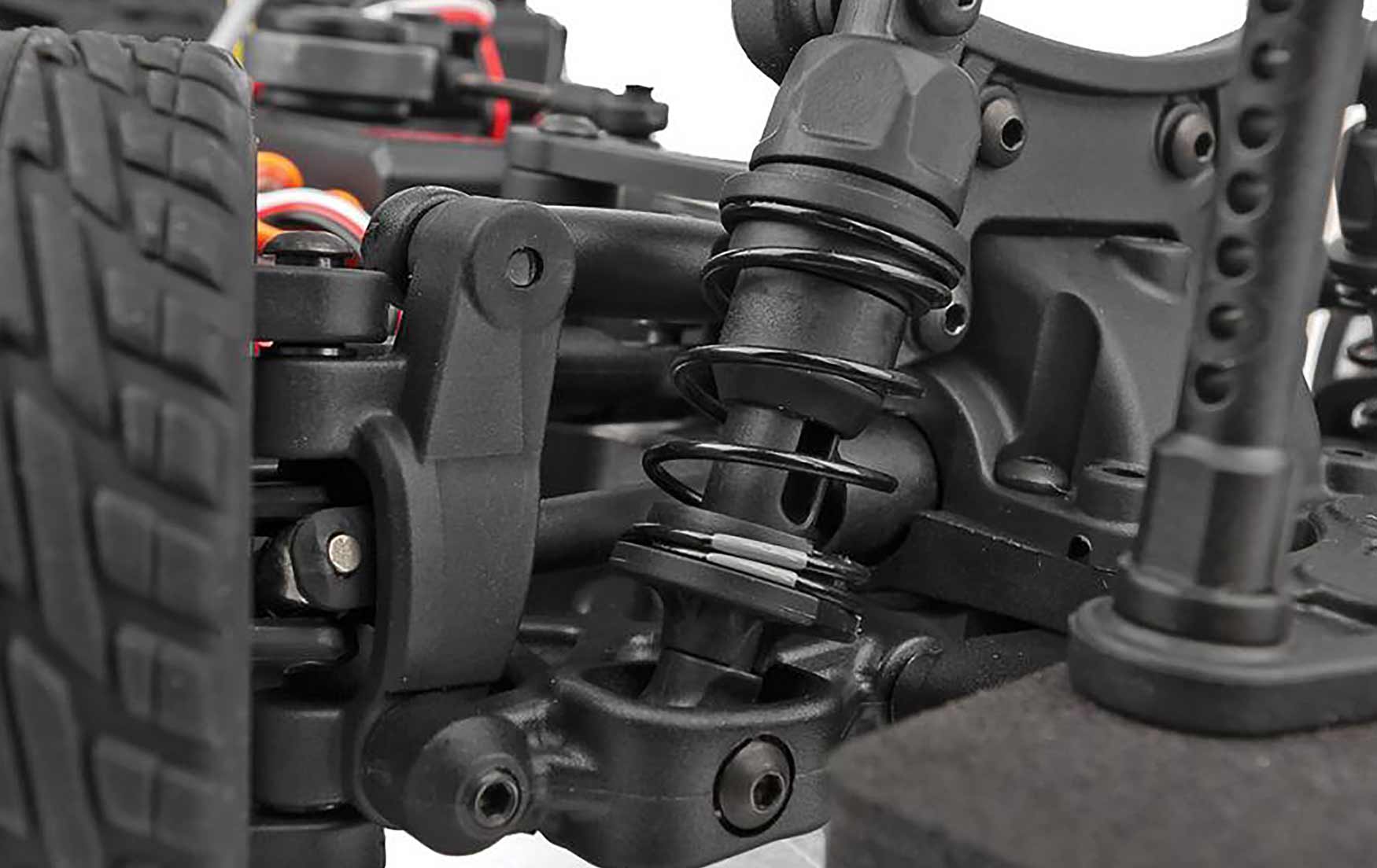 The Reflex 14R chassis has been updated from our previous version with the latest features in on-road racing. Sealed front and rear gear differentials, a molded tub chassis with covered center driveshaft, and adjustable shock positions. This makes it a perfect platform for the Hoonitruck and tire-slaying action!