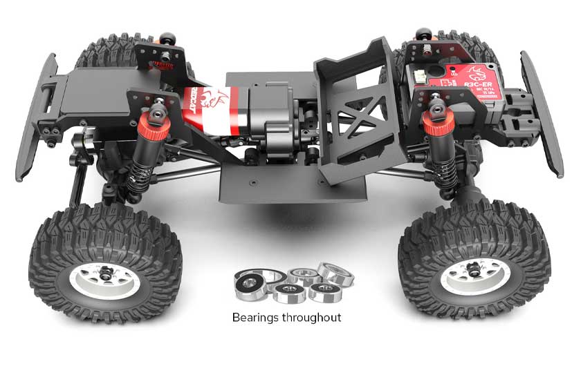 The Ascent-18 uses ball bearings, instead of bushings, throughout the vehicle to ensure smooth operation and longevity, setting it apart in the 1:18 scale crawler market.