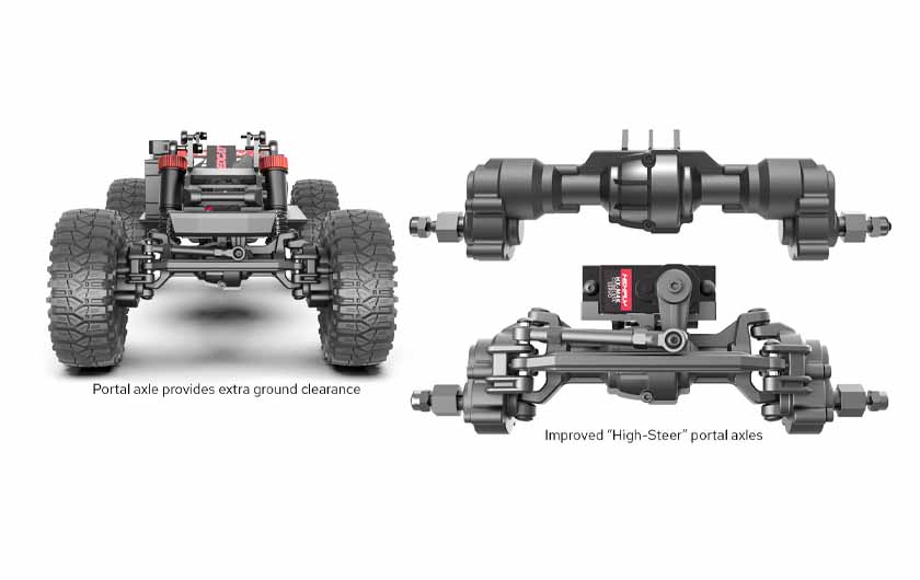To achieve the High Steer geometry we were looking for, we’ve redesigned the front axle housing, front portal, steering links, and added front portal universal shafts. This new “HIGH STEER” (HS) design provides increased steering and more ground clearance at the C-Hub and gives this mini crawler even more steering than its predecessors.