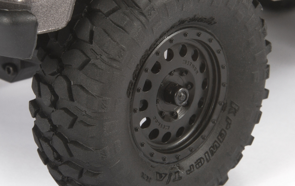 The MR307 Hole is a fresh take on the classic hole-wheel design that dominated early off road racing. Just like the Double Standard and NV, the Hole features a simulated beadlock ring by way of a strategically placed under-cut on the outer lip of the wheel. BFGoodrich Krawler™ T/A® KX tires are the winner of more rock-crawling championships than all other tires combined (Race spec tire, Years 2004 through 2008). The Axial version captures the same aggressive look you’ve been waiting for in a smaller 1/24 scale version.