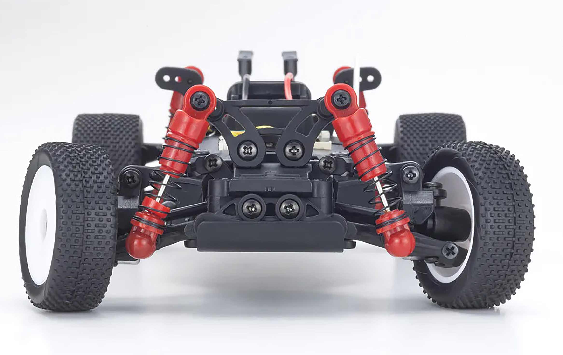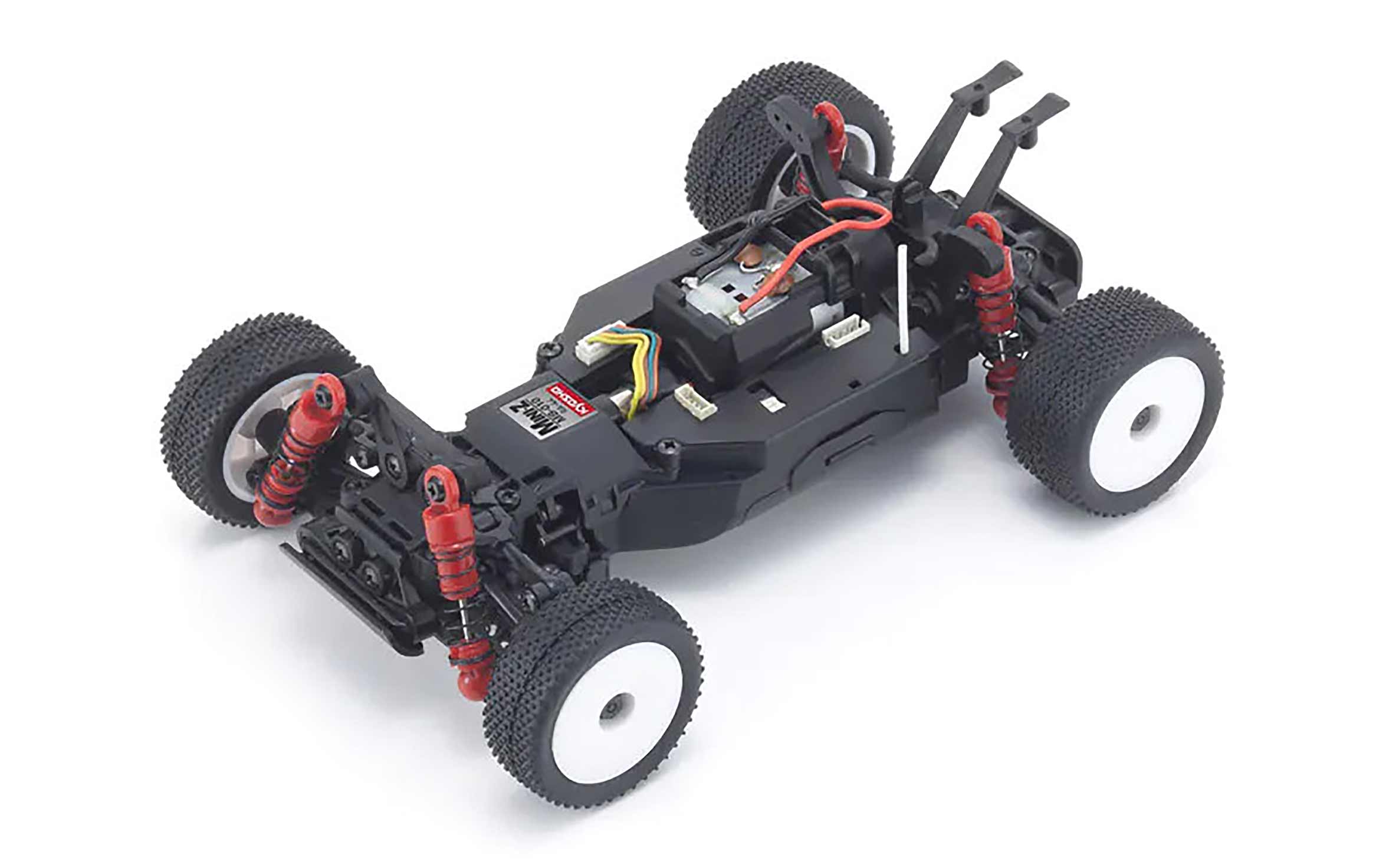 Simply add eight AAA-size alkaline batteries to this Readyset and the MINI-Z Buggy brings the fun of R/C car action. The advanced compact design includes 4WD drive train with slipper clutch to protect the gear system, and 4-wheel independent double wishbone suspension with oil-filled shocks to deliver true racing buggy performance. Most critical components are protected within the high-rigidity dustproof chassis shell. 7-stage geared steering servo provides plenty of torque for precision steering response and combines with the control program to realize the MINI-Z’s signature linear handling and light feel. The circuit board also features manual volume adjustment for the optional gyro unit that stabilizes straight line running and improves cornering control. Modeled on the popular Inferno MP9, the MINI-Z buggy body matches performance with style featuring a distinctive new printed color scheme complimented by black wheels for the sharpest looking machine on the track. The fully pre-assembled Readyset package makes it simple and enjoyable for anyone to experience advanced R/C buggy performance, whether it’s your first car or as fun-driving second car.