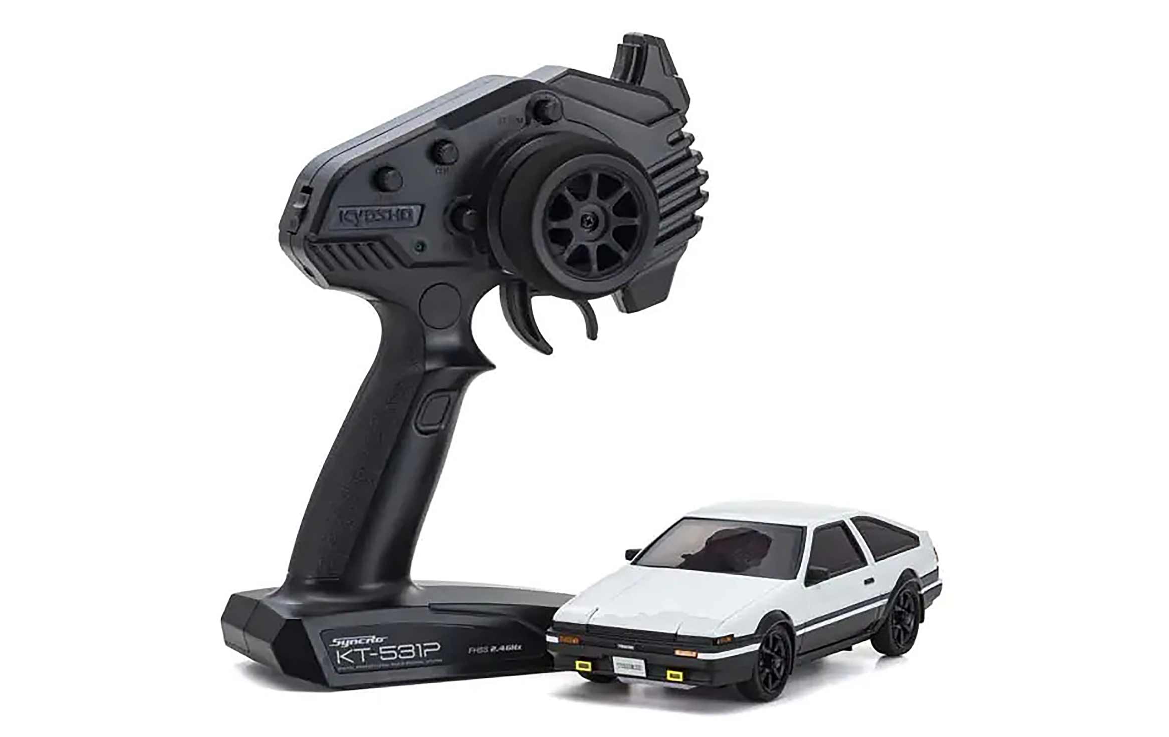 Includes stylish design of Syncro KT-531P transmitter. Features steering / throttle trim as well as dual rate adjustment of steering angle and control for the flashing speed of optional LEDs. In addition, the transmitter has a Training Mode feature which limits speed of the car for easy learning (default setting at the time of shipment is Training Mode).
