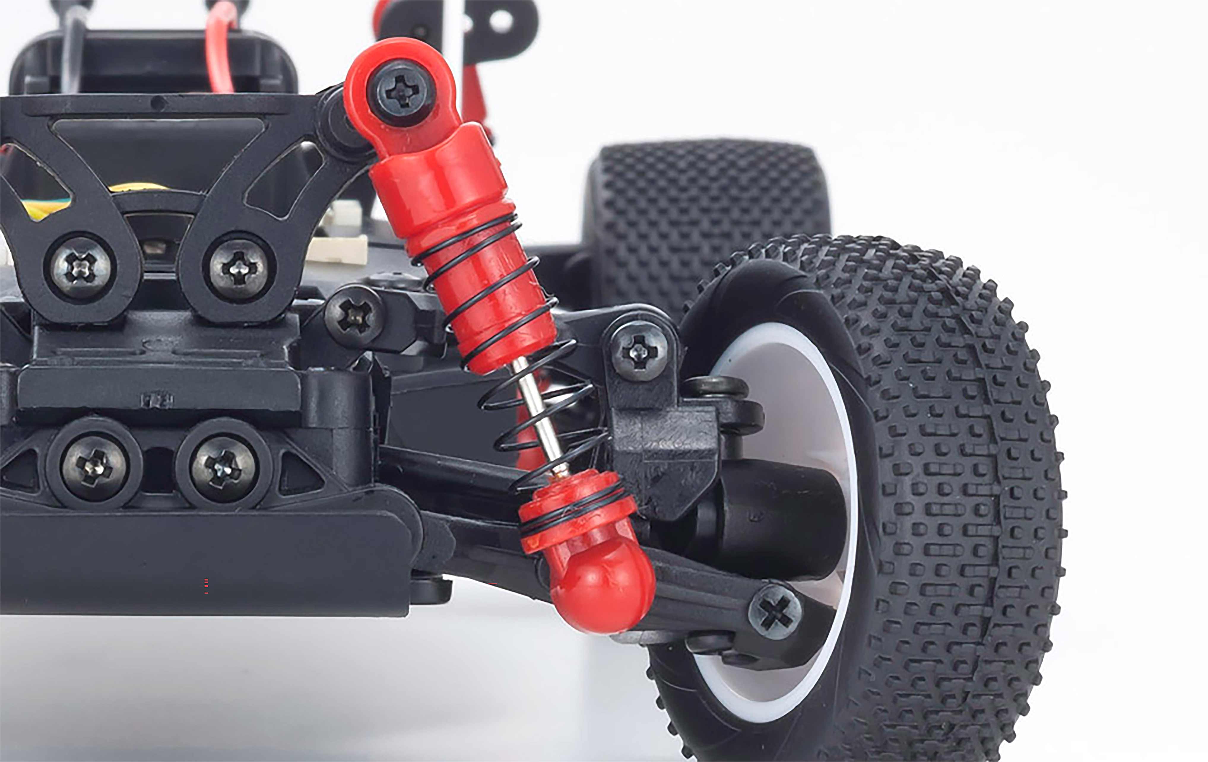 The advanced compact design includes 4WD drive train with slipper clutch to protect the gear system, and 4-wheel independent double wishbone suspension with oil-filled shocks to deliver true racing buggy performance. Most critical components are protected within the high-rigidity dustproof chassis shell. 7-stage geared steering servo provides plenty of torque for precision steering response and combines with the control program to deliver the MINI-Z’s signature linear handling and light feel. The circuit board also features manual volume adjustment for the optional gyro unit (sold separately) that stabilizes straight line running and improves cornering control. Modeled on the popular Inferno MP9, the MINI-Z buggy body matches performance with style featuring a distinctive new printed color scheme complimented by black wheels for the sharpest looking machine on the track. The fully pre-assembled Readyset package makes it simple and enjoyable for anyone to experience advanced R/C buggy performance, whether it’s your first car or as fun-driving second car.