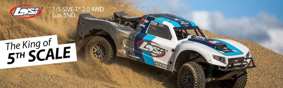 When the original 5IVE-T was introduced the world of 1/5-scale off-road racing changed, and this iconic platform became one of the most successful and influential platforms to date. Now get ready for 2.0! The Losi 5IVE-T 2.0 BND: 1/5 4WD Gas Short Course Truck has all of the unrivaled performance of its predecessor and includes Bind-N-Drive technology, allowing you to pick the transmitter that best fits your lifestyle. The powerful Zenoah G320 32cc engine has been built specifically for the 5IVE-T 2.0. The revised chassis layout reduces the front drive shaft angle for improved durability and increased 4WD balance. Plus, the new rack style bellcrank steering assembly makes for easy Ackermann changes and overall improved steering geometry. Additional advances include an updated front hood, upgraded brakes, and hard anodized bleeder caps and shock bodies for improved shock performance. All this ensures the 5IVE-T 2.0 continues to reign supreme.
