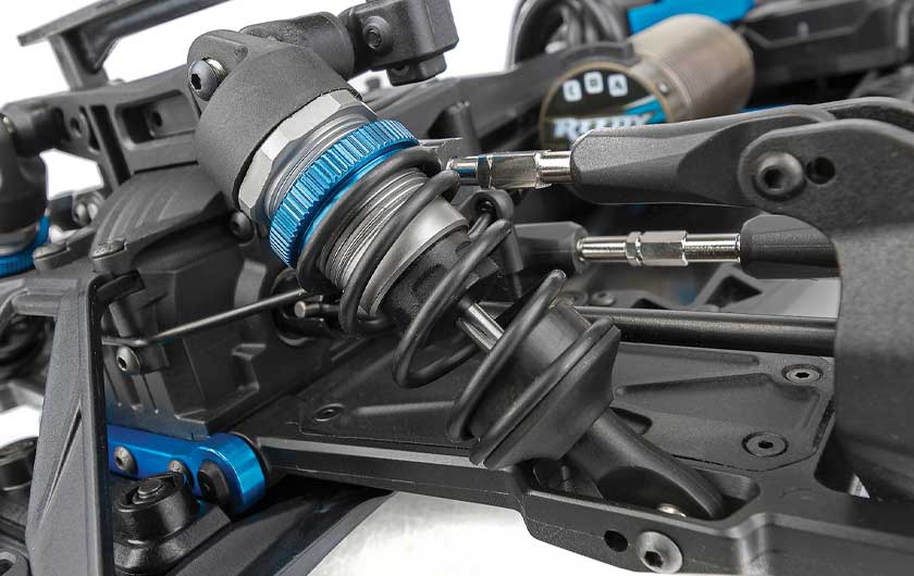 Threaded, aluminum oil-filled shocks with adjustable positions.