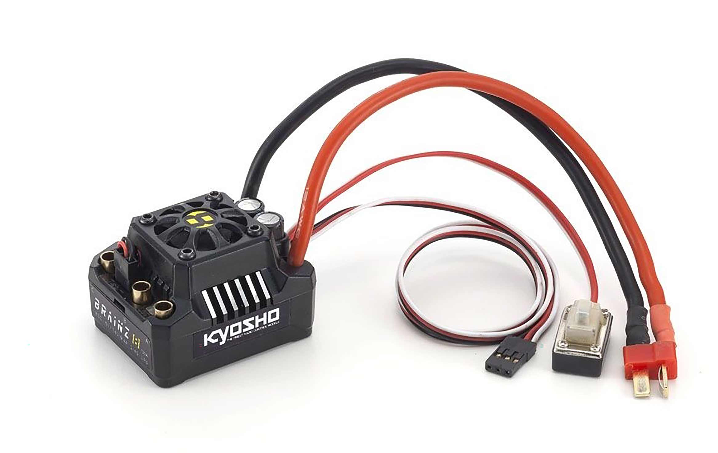KYOSHO SPEED HOUSE BRAINZ8 ESC with electric cooling fan features a 10-item program that allows precision adjustments such as brake, timing advance, cutoff voltage and heat protection.