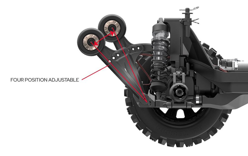 The Kaiju includes aluminum body adjustable coil-over shocks with threaded body.
