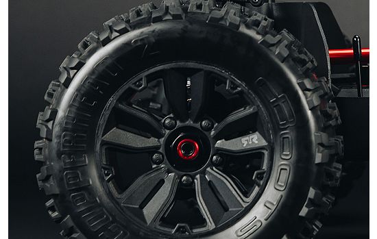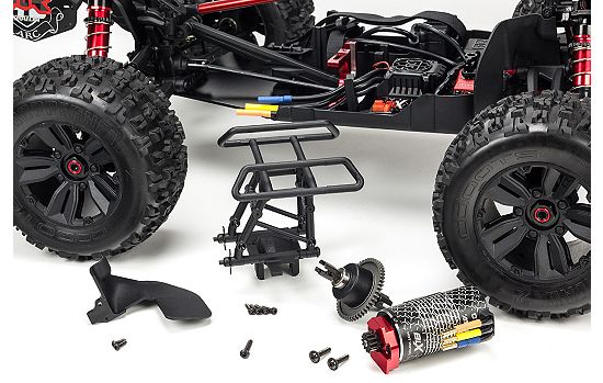 ARRMA® holds your maintenance downtime to the minimum with an efficient, driver-friendly design. A sliding mount allows quick, hassle-free motor access. The center diff is easy to reach and can be removed by taking out just seven bolts. Topping it all off is a monster truck body with streamlined good looks, featuring a red/black or blue/black trim and ultra-detailed decals.