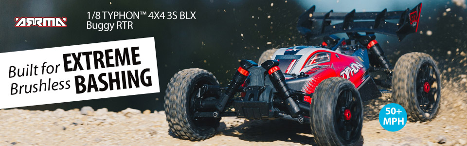 The TYPHON™ 4X4 3S BLX brings the power, strength, and style of the TYPHON 6S BLX buggy to a 3S-capable version that reaches extreme 50+ mph speeds. Making your move into 1/8 scale brushless buggy bashing has never been easier — or more exciting!