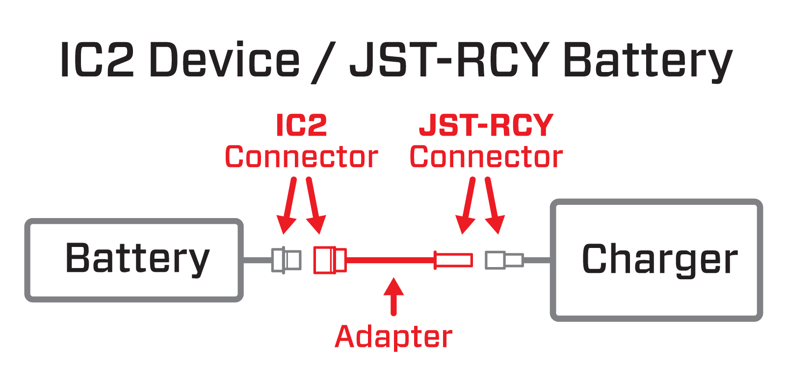 • This adapter adapts a battery with an IC2 connector to a device with a JST-RCY connector