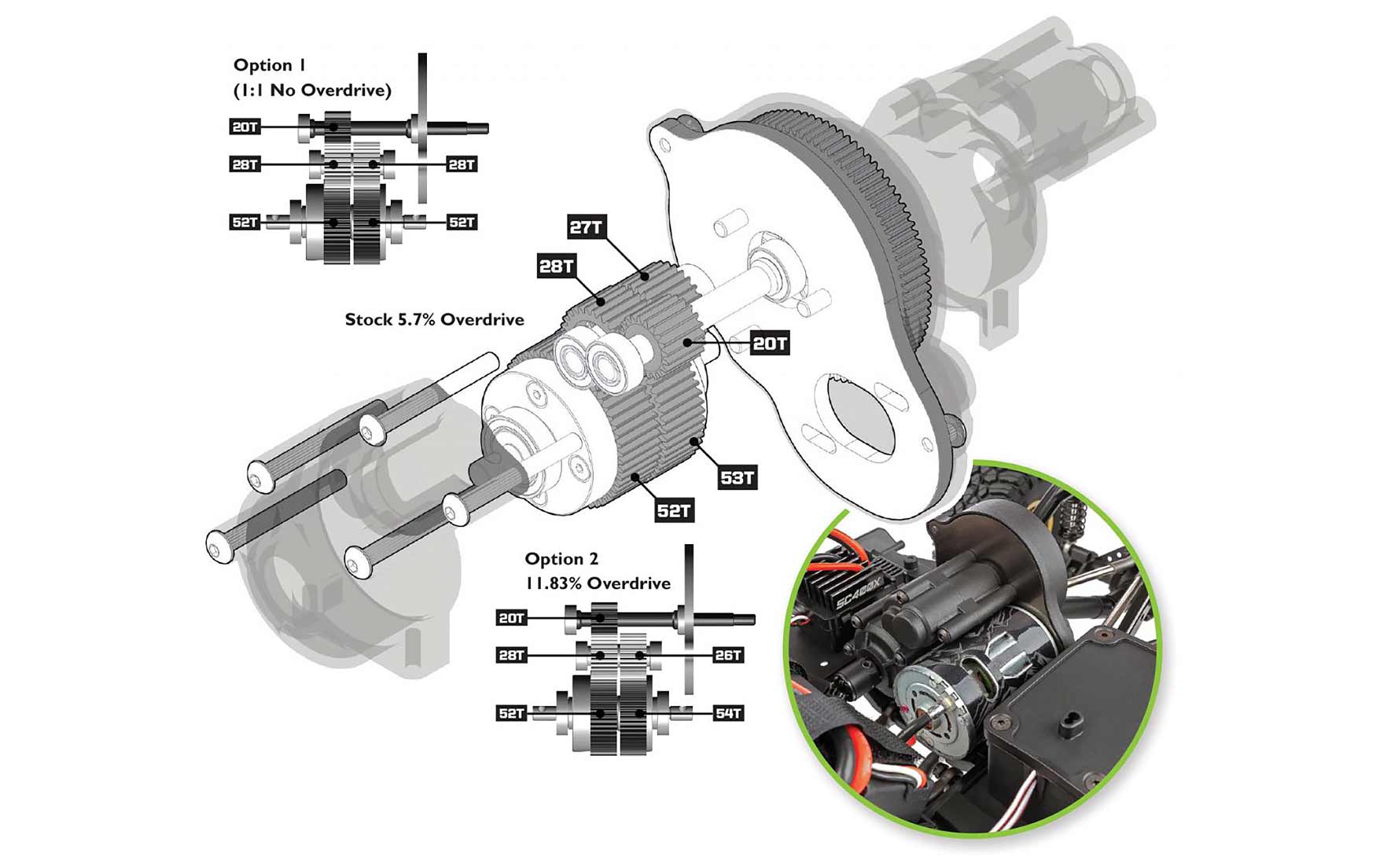 The transmission features the ability to adjust the rear drive ratio independently of the front drive in 3 levels: stock overdrives the front 5.7%, option 1 (not included) is a one-to-one drive ratio and option 2 overdrives the front 11.83%.