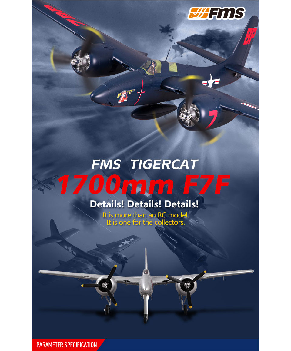 The FMS F7F Tigercat PNP 1700mm represents the best FMS classic works has to offer to date. It adopts the popular quick and easy assembly and disassembly structure—no glue required. In addition, this model features the latest in multi-connect technology with streamlined wiring that eliminates the hassle of making multiple connections at the wing joint. Lightweight construction with EPO means you can count on a high-level of durability and a light wing load that translates naturally into incredible flight performance. The water-based paint used to finish this model minimizes blistering from sun and provides a vibrant appearance. Each control is individually linked with one or more dedicated metal-gear digital micro servos. You’ll also appreciate the precision and adjustability of ball-link equipped pushrods for initial setup and perhaps later on if flight trimming is necessary.