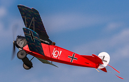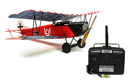 The FlyZone Fokker D.VII model is packed fully-assembled and ready to fly right out of the box. Inside the box you’ll find a transmitter equipped with 2.4GHz technology and conveniently integrated with a LiPo flight battery charger, AA batteries for the transmitter, and a rechargeable 1S LiPo battery that delivers long flight times. There's nothing extra to buy and you can be ready to fly in less time than it takes to charge the flight battery.