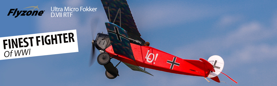 Bold and immensely talented, Ernst Udet helped to close WWI as Germany’s second-highest scoring ace with 62 victories. Internationally accepted as the finest fighter of the era, one particular Fokker D.VII he flew boasted an inspirational color scheme designed to honor his sweetheart and taunt all in the sky who challenged him. The FlyZone® ultra-micro Fokker D.VII RTF beautifully replicates the historic masterpiece with an RC version that’s ready-to-fly and engineered so that even novice pilots can reenact missions indoors and fly daring patrols in backyard spaces.