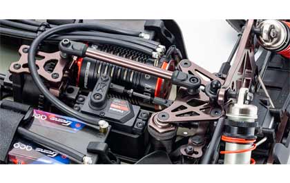 Equipped with the same aluminum oil shocks as the MP10T for high heat dissipation and stable function. As the MP10Te has a higher front load than the GP model, the MP10Te is also equipped with a special front spring adjuster.