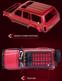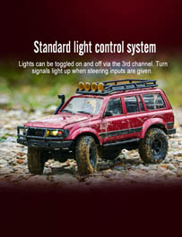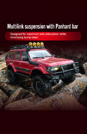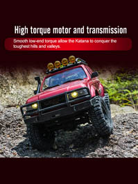 A feature-packed trail-proven chassis drives the Katana. Aluminum rails provide a rigid platform while a multilink geometry with panhard bar chassis design allows for maximum axle articulation. Power is delivered from the super high-torque gearbox to ultra grippy beadlock tires via nylon driveshafts. Water-resistant 2S 7.4V electronics consists of an independent servo, 2-in-1 receiver/ESC, 050 motor and 7.4V 600mAh battery; Allowing for high power-to-weight ratio and all weather operations. If you want the best looking, best performing 1:18 scaler on the market, look no further than the ROC Hobby Katana!