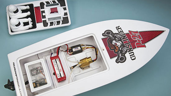 Until now, there’s never been an R/C boat sporting a true RTR crackerbox hull. Introducing the P-27 Gunslinger, a brushless, LiPo-ready off-shore racer that's the first of its kind. The unique hull design not only makes the P-27 Gunslinger fast on the water, it's also very responsive and lots of fun to drive. Power is provided by a 6-pole brushless motor and 50A controller, and the included Tactic radio system delivers confident control.